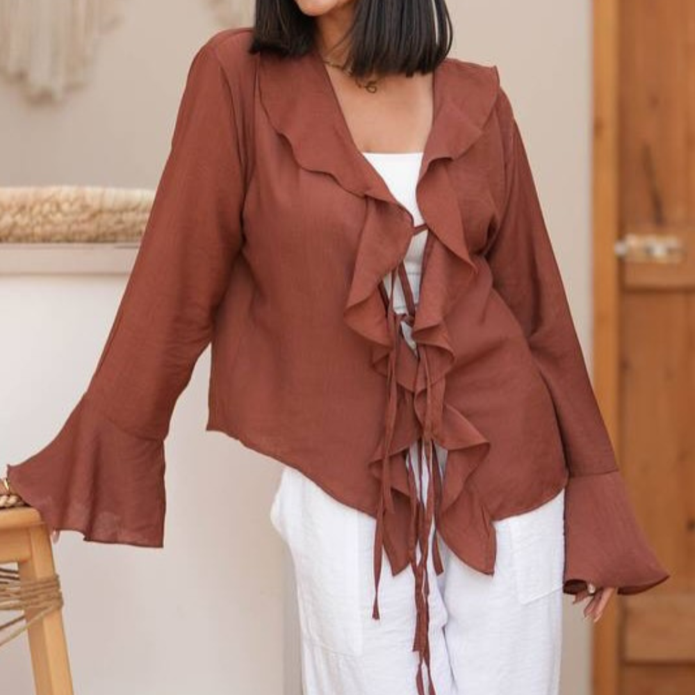 Ta bluzka z falbaniastym dekoltem w kształcie litery V łączy kobiecość z odrobiną zabawnej elegancji. Falbany przy dekolcie dodają romantyzmu, a wiązanie w talii podkreśla sylwetkę. Lekki materiał pięknie się układa, idealny na ciepłe dni lub do noszenia warstwowo. Luźny krój sprawia, że pasuje zarówno do codziennych, jak i bardziej eleganckich stylizacji. Uniwersalny i stylowy dodatek do każdej garderoby.