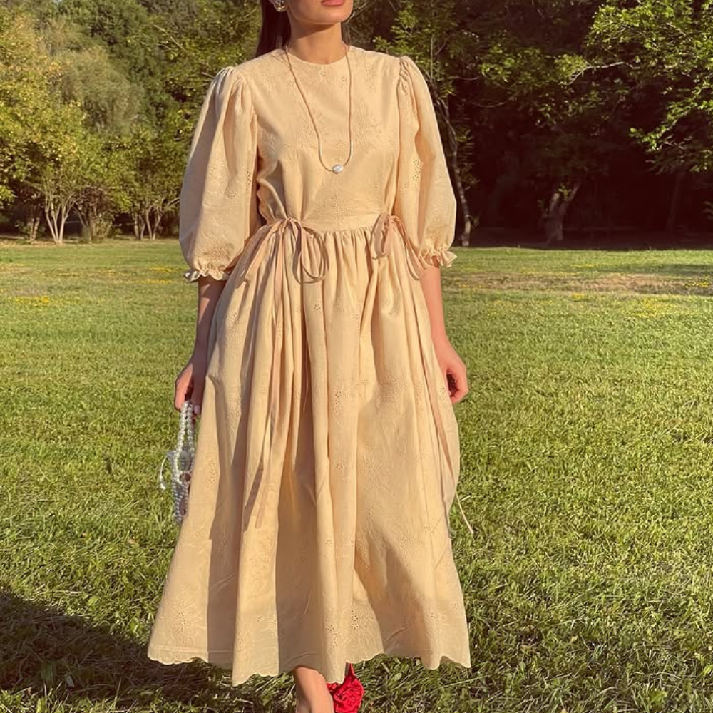 Ta sukienka z puffowymi rękawami i baskinką łączy styl inspirowany vintage z nowoczesną kobiecością. Obfite rękawy i talia z baskinką nadają jej odrobinę dramatyzmu i elegancji. Oddychający materiał zapewnia komfort przez cały dzień, a zwiewny dół tworzy smukłą sylwetkę. Idealna na codzienne przyjęcia w ogrodzie lub eleganckie spotkania na świeżym powietrzu. Uroczy i kobiecy model, który przyciągnie uwagę.